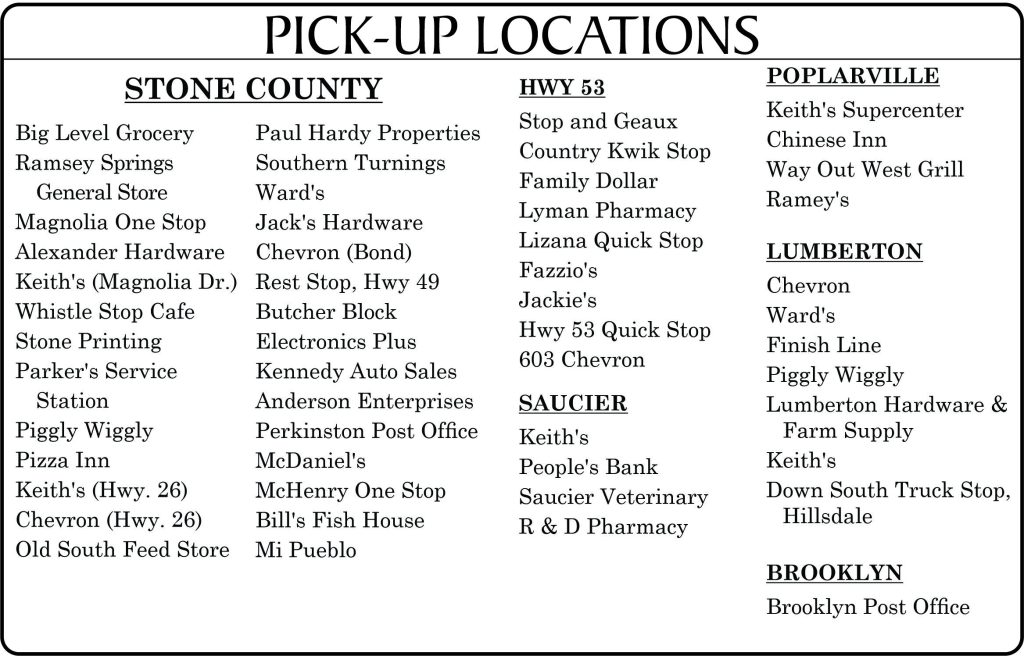Distributed every 1st and 3rd Wednesday in Stone County, Saucier, Lizana, Poplarville, Lumberton, Brooklyn, Bond and Benndale.
